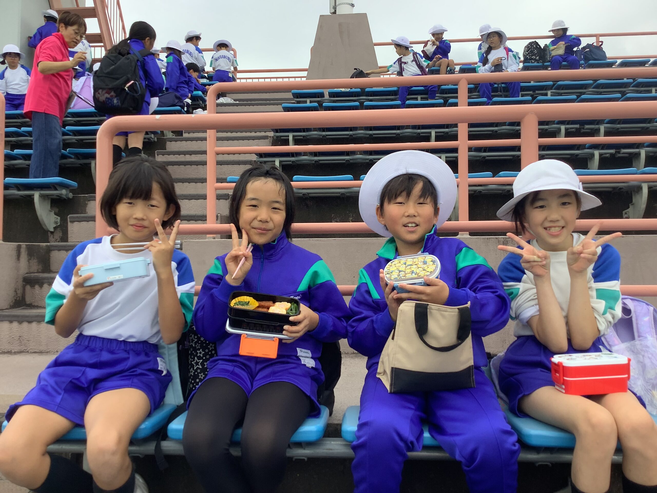 お弁当は鴻池運動公園で。ご厚意で特別にフイールドの観客席で食べることができました。