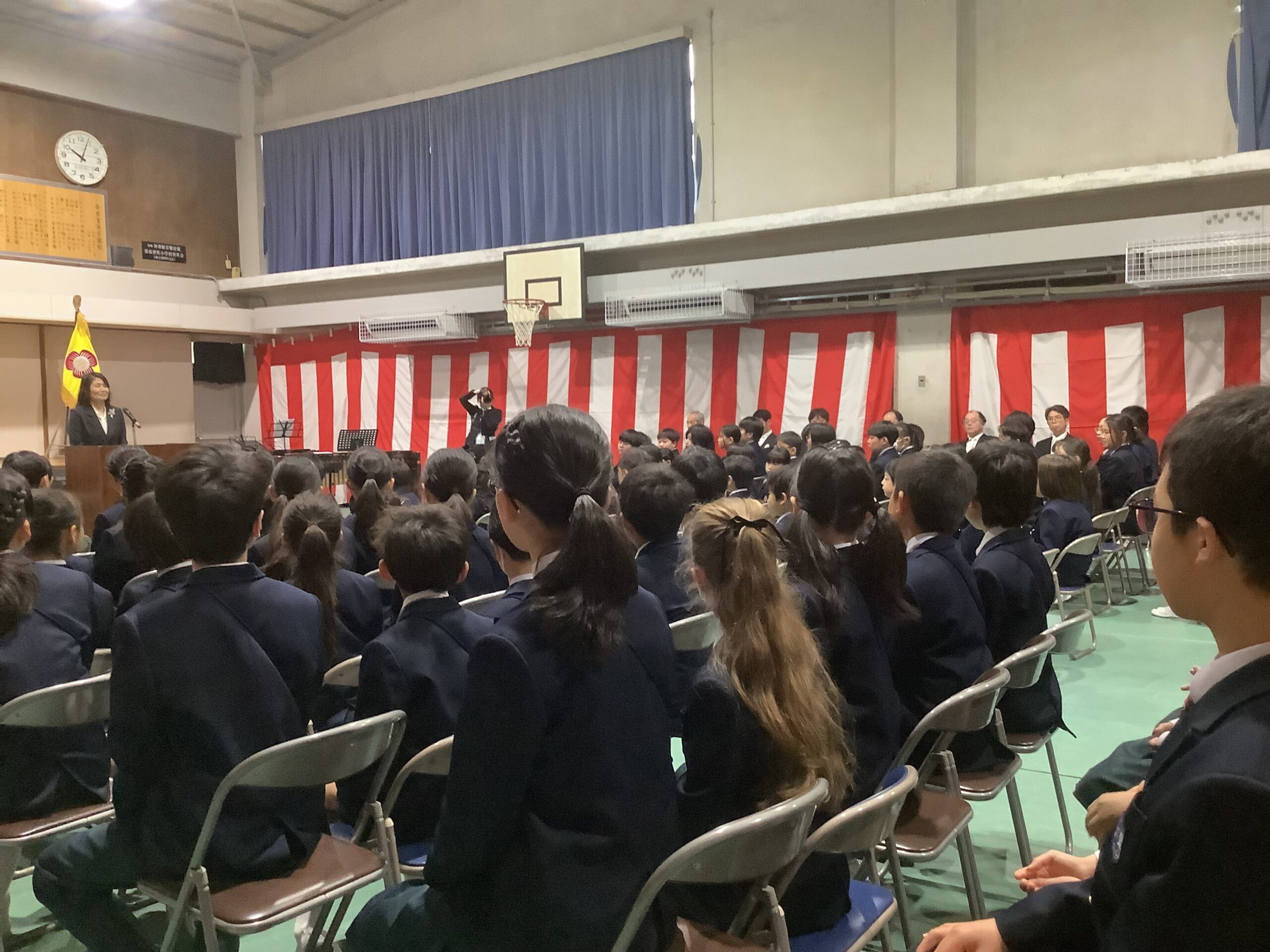 本校では全学年で1年生を迎えます。あたたかい雰囲気の中での入学式でした。1年生の皆さんは、お名前を呼ばれて元気に「はい!」が言えましたね。